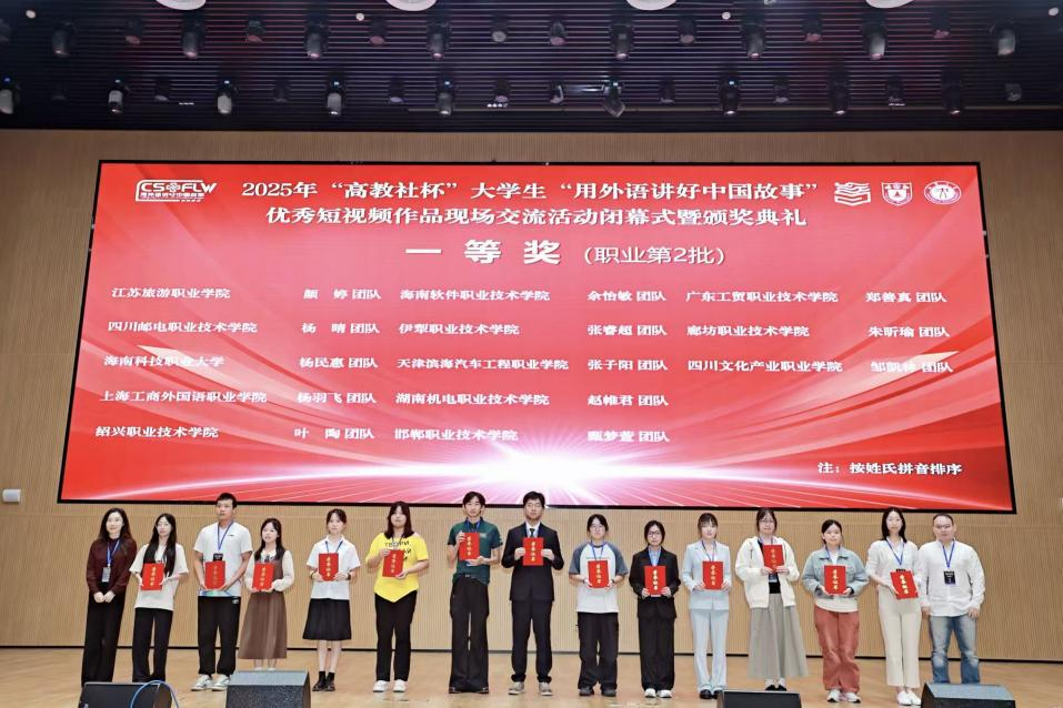 9月19日至21日,2025年“高教社杯”大学生“用外语讲好中国故事”优秀短视频现场交流活动在武汉市江汉大学举行。我校参赛团队作品《一脉黄酒香,杯盏融中外》荣获职业组全国一等奖,指导教师单幸妤获评“优秀指导教师”,学生团队成员为戴小红、张凯雁、叶陶、黄宇婷。