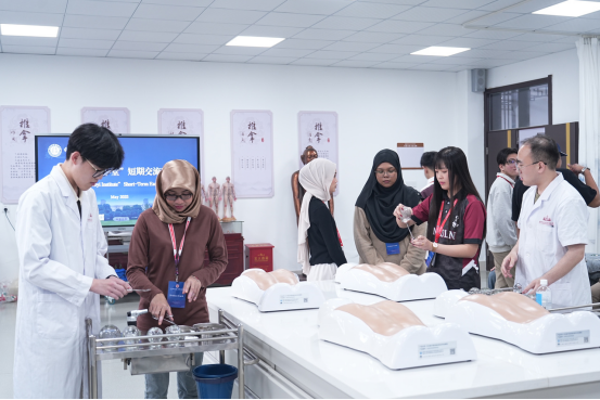 活动期间,“中马越医学堂”学员实地考察成人影片中医药博物馆、护理实训中心、智慧城市产教综合体、书法实践基地、现代商贸服务实训中心、浙江省通用砂浆研究院、安全体验馆、模型馆等实训基地,直观感受学校的教学条件、专业建设与产教融合模式等;在趣味汉语学习中掌握日常对话用语,加入书法课堂,在横竖撇捺间感受中华书法文化的博大精深;聆听中医药知识讲座、近距离感受艾灸、刮痧、推拿、针灸等中医适宜技术,考察绍兴市中医院,共同完成香囊、中医药膳的制作,切实感受中医药文化的深厚底蕴;展开兰亭、鲁迅故里、仓桥直街、黄酒小镇等城市文化之旅,在千年文脉的沉浸式探访中深化文化互鉴;此外,中马师生共上一堂课,共同开展护理技能交流,并邀请马来西亚林肯大学学院护理与应用科学学院副院长Dr. SMITHA POOVATHINKAL MADHAVAN为中外师生带来Nursing Futures: Educate and Elevate讲座,推动国际护理理念互鉴创新。