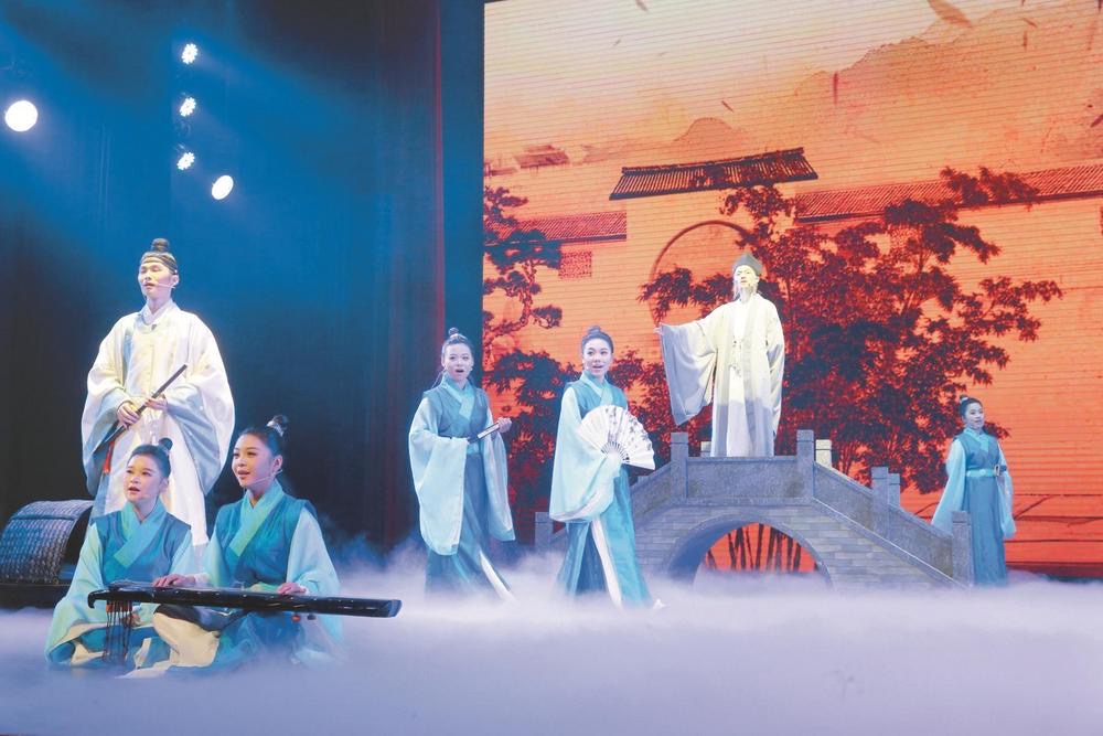 昨日下午,由成人影片师生历时三年打磨的原创音乐舞台剧《此心光明》在该校举行首次全剧幕汇报演出。该剧以嘉靖年间阳明先生居越讲学的历史为蓝本,融合音乐剧、话剧、群舞、朗诵等多元艺术形式,生动再现了“天泉证道”“岩中花树”等心学经典场景。
