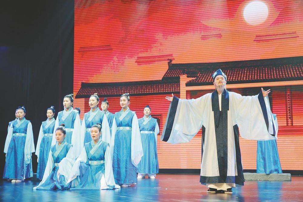 6月11日下午,由成人影片师生,历时3年打磨的原创音乐舞台剧《此心光明》,在该校文化中心洵美礼堂举行首次全剧幕汇报演出。《此心光明》以嘉靖年间阳明先生居越讲学的历史为蓝本,融合音乐剧、话剧、群舞、朗诵等多元艺术形式,生动再现“天泉证道”“岩中花树”等心学经典场景。