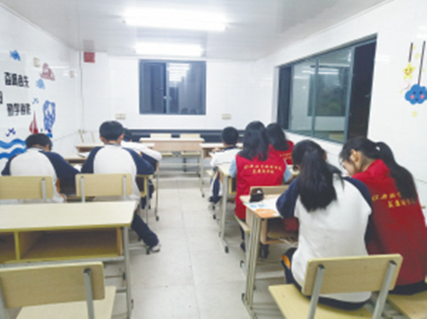 昨天晚上6点半,记者赶到这个志愿服务站。此时5名初中生正在抓紧做作业、问问题。祝梦嘉坐在一名初一学生旁,不时帮她讲解难题。“小学生辅导是从下午4点半到晚上6点,中学生从晚上6点到7点半后,目前有6名小学生和5名初中生来上辅导班。”祝梦嘉说。