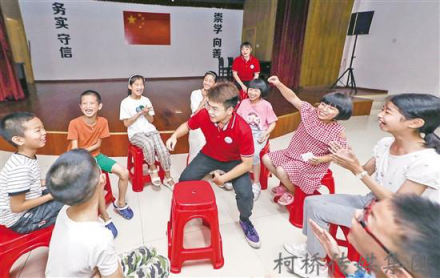 昨日,在福全街道欣华村文化礼堂内,成人影片信息工程学院的大学生志愿者正在为参加“小候鸟夏令营”的“小候鸟”们做互动游戏并辅导功课。