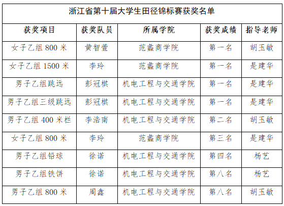 6月5日,浙江省第十届大学生田径锦标赛在台州市体育发展中心落幕。我校田径队在赛场上奋勇拼搏,获得4金1银1铜的优秀成绩。