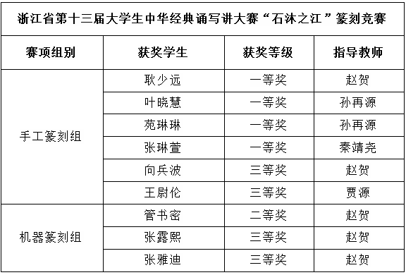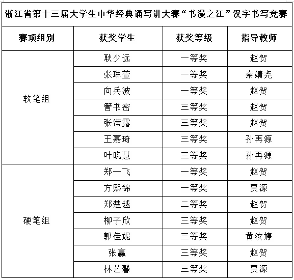6月28至29日,浙江省第十三届大学生中华经典诵写讲大赛“石沐之江”篆刻竞赛和“书漫之江”汉字书写竞赛决赛落幕,经过激烈角逐,我校书画艺术(书法)专业获一等奖9项,二等奖2项,三等奖10项(由初赛评选),7名一等奖学生入围国赛。