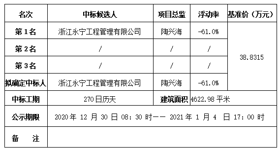 成人影片建设的成人影片艺术教学楼建设工程监理,于2020年12月29日14时30分在绍兴市越城区山阴路526号成人影片二楼会议室开标。按招标文件规定的评标方法,已确定中标候选人,现将有关内容公示如下: