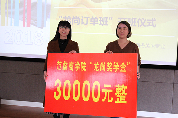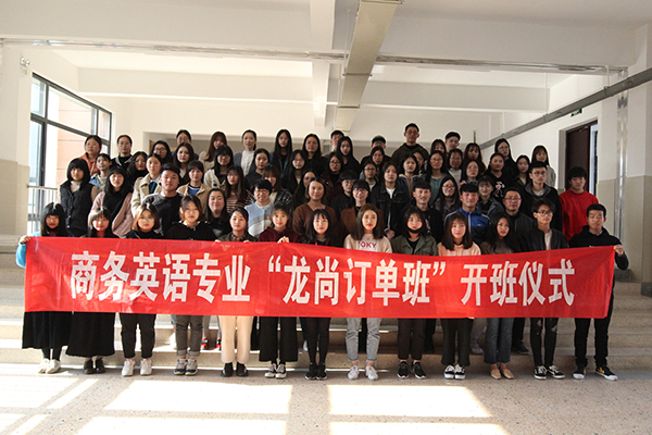 经过周密的准备,“龙尚订单班”在范蠡商学院商务英语专业正式设立开班。首届订单班从2016级、2017级商务英语专业学子中选拔招收了78名学员,为“尚龙教育”定向培养高素质教育培训人才。同时,谢飞校友还每年出资3万元,设立奖学金,激励专业学子成长成才。