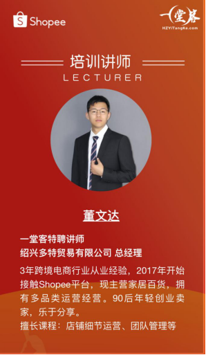 董文达同学现已受聘为Shopee官方认证培训机构——杭州壹堂课信息科技有限公司培训讲师。