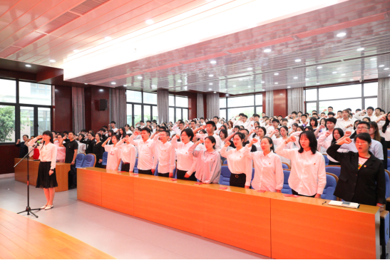 宣誓仪式由绍兴市直教育系统优秀共产党员、省高校“三育人”先进个人高亚红老师领誓。各二级学院党总支师生党员代表一起重温入党誓词。