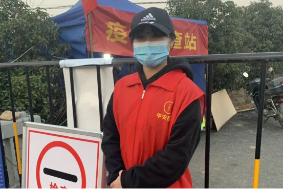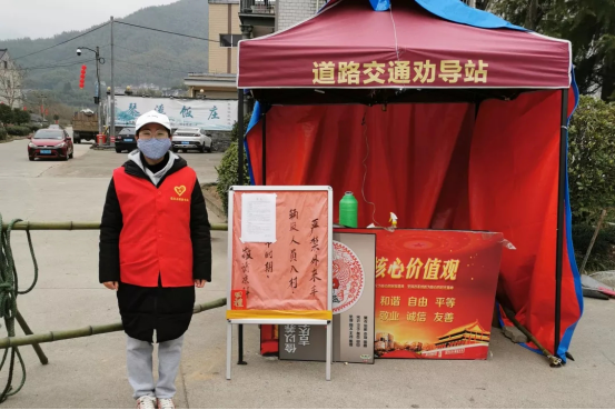 自2月6日起,护理学院17护理4班王舒妮同学在桐庐县琴溪村王家岭路口参与道路防控志愿服务工作,主要工作是量体温及人员管控。