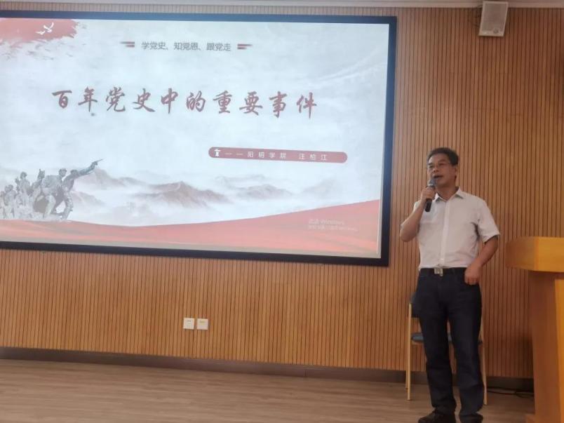 校党委委员、阳明学院院长汪柏江以“百年党史中的重要事件”为主题为全体教师上了一堂生动的党课。他结合自身经历,分享学习党史的心得和体会,梳理了党史的发展脉络,讲解了中国共产党的初心和使命,通过对党创立以来的重大事件、重要会议、重要人物进行回顾,将中国共产党艰苦卓绝的斗争历程深深刻入每个党员的思想。希望广大党员从党的百年伟大奋斗历程中汲取继续前进的智慧和力量。