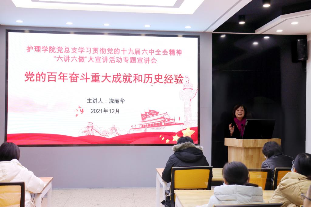 为深入学习贯彻党的十九届六中全会精神,认真落实省委关于开展好“六讲六做”大宣讲活动要求,12月29日,我校党委书记沈丽华同志以《党的百年奋斗重大成就和历史经验》为主题,为护理学院全体教师讲授专题党课。