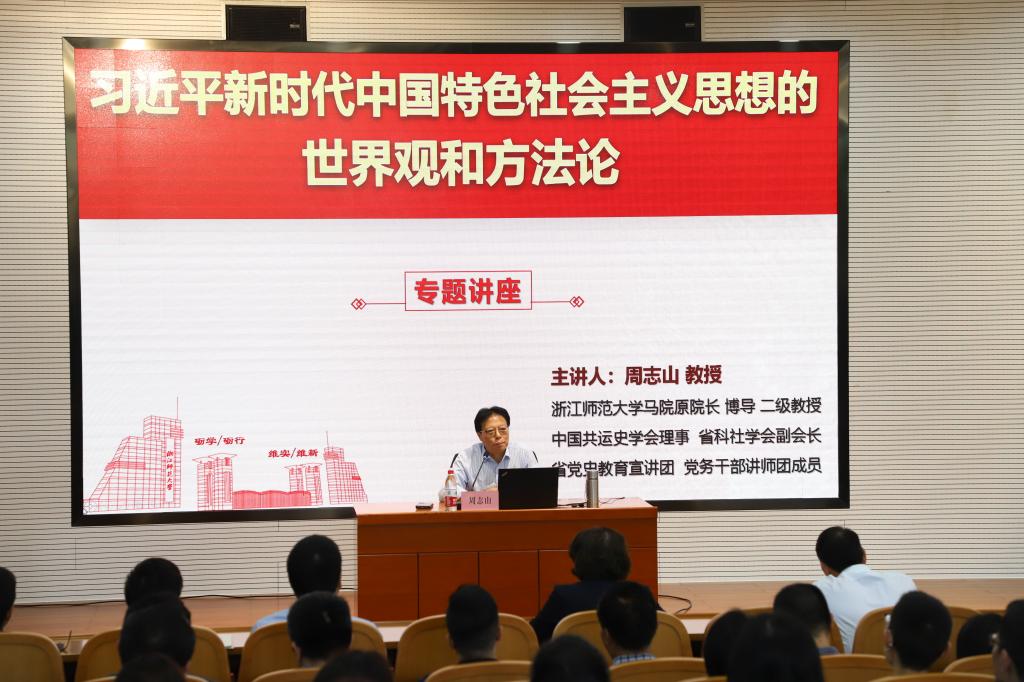 为深入学习贯彻习近平新时代中国特色社会主义思想,扎实推进主题学习教育见成效,10月17日,我校马克思主义学院邀请浙江师范大学马克思主义学院原院长、二级教授、博士生导师周志山教授在学校卓雅厅做了以“习近平新时代中国特色社会主义思想的世界观和方法论”为主题的专题讲座。学校领导,中层干部,各党总支书记、副书记,支部书记,马院全体教师以及党员教师代表参加了专题学习。